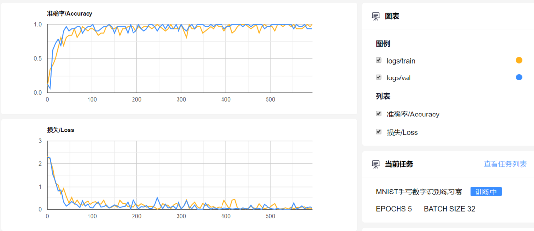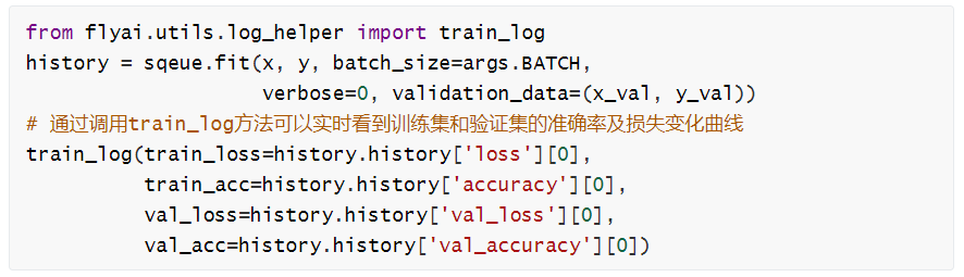 通过调用FlyAI提供的train_log方法可以在训练过程中实时的看到训练集和验证集的准确率及损失变化曲线。