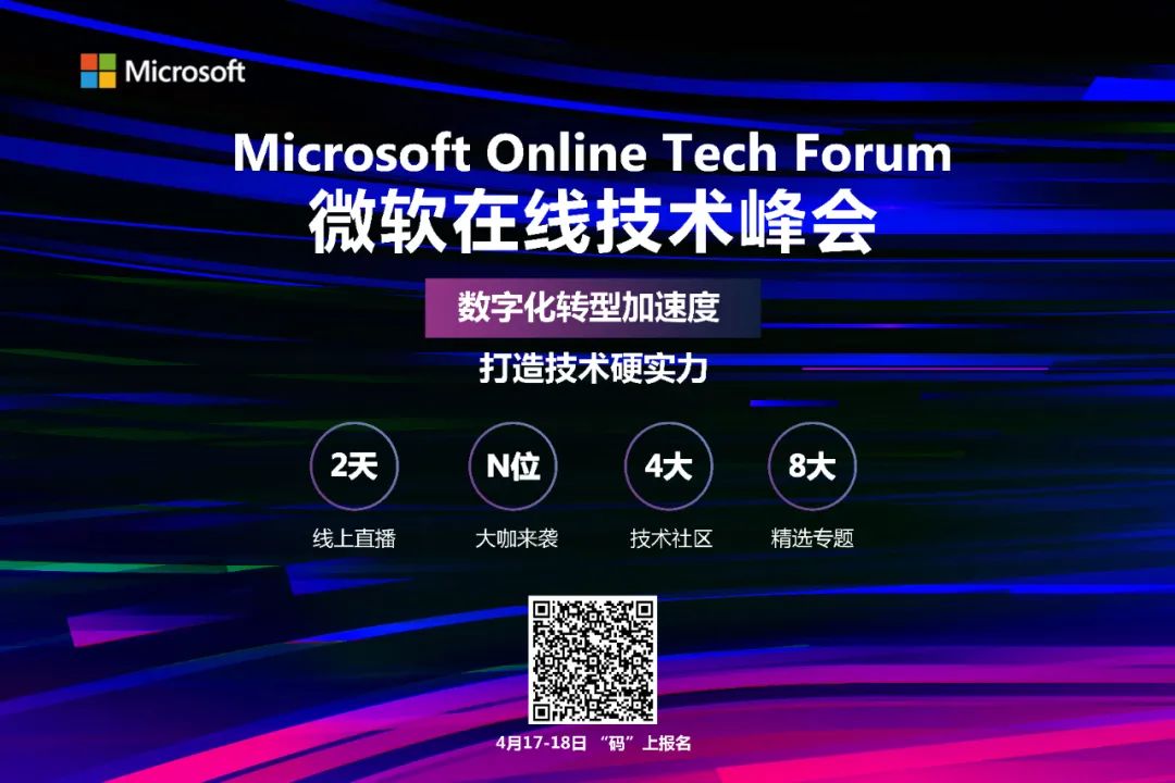 4 月 17-18 日,首届 Microsoft Online Tech Forum 微软在线技术峰会将在线上正式拉开帷幕!!!此次会上,微软将会围绕“数字化转型加速度”为主题,以微软自身技术产品和行业实践为引,通过在技术层面持续推陈出新,以站在行业数字生态的视角全面分享微软在云、生产力、商业应用以及实践落地这 4 大数字化场景下的技术创新与行业洞察,以期能够加速行业内的数字化进程,引领业界未来数字生态的趋势走向。