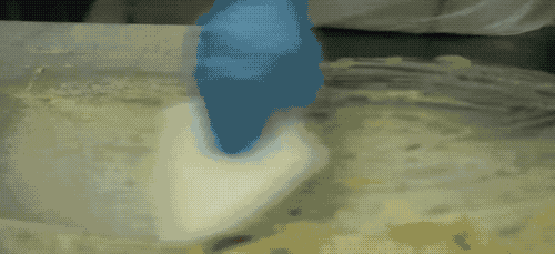 因为机器打果泥可能会混入一些细小的果核啊、纤维什么的,所以还需要人工进行仔细的挑选。用刮板把果泥在台面上刮平,靠「火眼金睛」去找杂质,并用镊子拣选出来。