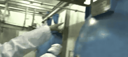 成熟的榴莲保质期很短,需要尽快进行加工处理。首先利用可食用氯进行果皮杀菌,就在下图这样的处理室内进行。