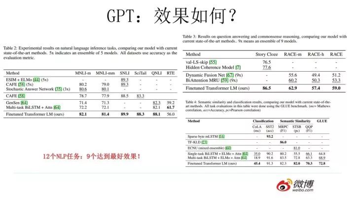 GPT的效果是非常令人惊艳的,在12个任务里,9个达到了最好的效果,有些任务性能提升非常明显。