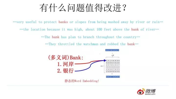 这片在Word Embedding头上笼罩了好几年的乌云是什么?是多义词问题。我们知道,多义词是自然语言中经常出现的现象,也是语言灵活性和高效性的一种体现。多义词对Word Embedding来说有什么负面影响?如上图所示,比如多义词Bank,有两个常用含义,但是Word Embedding在对bank这个单词进行编码的时候,是区分不开这两个含义的,因为它们尽管上下文环境中出现的单词不同,但是在用语言模型训练的时候,不论什么上下文的句子经过word2vec,都是预测相同的单词bank,而同一个单词占的是同一行的参数空间,这导致两种不同的上下文信息都会编码到相同的word embedding空间里去。所以word embedding无法区分多义词的不同语义,这就是它的一个比较严重的问题。