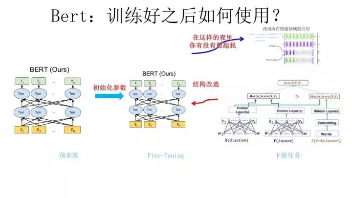 假设如上图所示,我们有个NLP的下游任务,比如QA,就是问答问题,所谓问答问题,指的是给定一个问题X,给定另外一个句子Y,要判断句子Y是否是问题X的正确答案。问答问题假设设计的网络结构如上图所示,这里不展开讲了,懂得自然懂,不懂的也没关系,因为这点对于本文主旨来说不关键,关键是网络如何使用训练好的Word Embedding的。它的使用方法其实和前面讲的NNLM是一样的,句子中每个单词以Onehot形式作为输入,然后乘以学好的Word Embedding矩阵Q,就直接取出单词对应的Word Embedding了。这乍看上去好像是个查表操作,不像是预训练的做法是吧?其实不然,那个Word Embedding矩阵Q其实就是网络Onehot层到embedding层映射的网络参数矩阵。所以你看到了,使用Word Embedding等价于什么?等价于把Onehot层到embedding层的网络用预训练好的参数矩阵Q初始化了。这跟前面讲的图像领域的低层预训练过程其实是一样的,区别无非Word Embedding只能初始化第一层网络参数,再高层的参数就无能为力了。下游NLP任务在使用Word Embedding的时候也类似图像有两种做法,一种是Frozen,就是Word Embedding那层网络参数固定不动;另外一种是Fine-Tuning,就是Word Embedding这层参数使用新的训练集合训练也需要跟着训练过程更新掉。