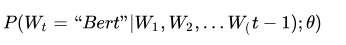 上面是闲话,闲言碎语不要讲,我们回来讲一讲NNLM的思路。先说训练过程,现在看其实很简单,见过RNN、LSTM、CNN后的你们回头再看这个网络甚至显得有些简陋。学习任务是输入某个句中单词 Wt = "Bert" 前面句子的t-1个单词,要求网络正确预测单词Bert,即最大化: