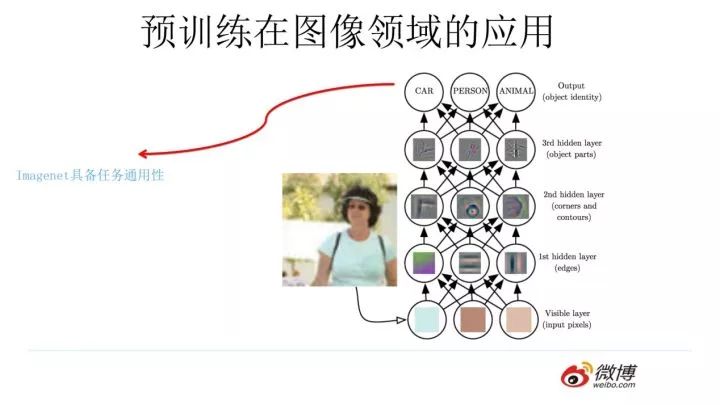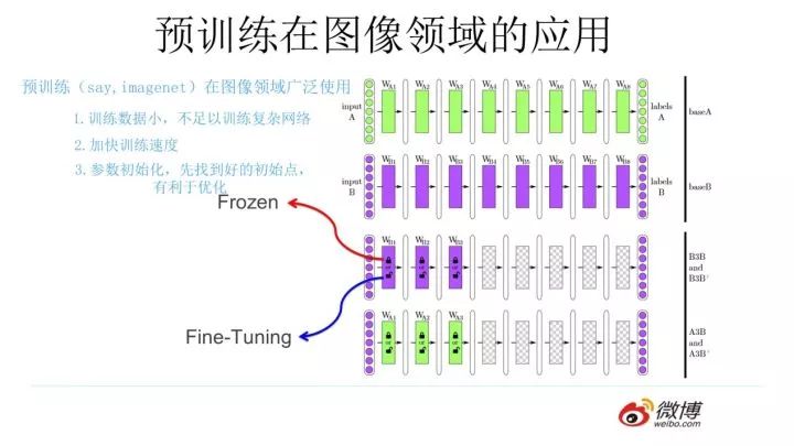 那么图像领域怎么做预训练呢,上图展示了这个过程,我们设计好网络结构以后,对于图像来说一般是CNN的多层叠加网络结构,可以先用某个训练集合比如训练集合A或者训练集合B对这个网络进行预先训练,在A任务上或者B任务上学会网络参数,然后存起来以备后用。假设我们面临第三个任务C,网络结构采取相同的网络结构,在比较浅的几层CNN结构,网络参数初始化的时候可以加载A任务或者B任务学习好的参数,其它CNN高层参数仍然随机初始化。之后我们用C任务的训练数据来训练网络,此时有两种做法,一种是浅层加载的参数在训练C任务过程中不动,这种方法被称为“Frozen”;另外一种是底层网络参数尽管被初始化了,在C任务训练过程中仍然随着训练的进程不断改变,这种一般叫“Fine-Tuning”,顾名思义,就是更好地把参数进行调整使得更适应当前的C任务。一般图像或者视频领域要做预训练一般都这么做。