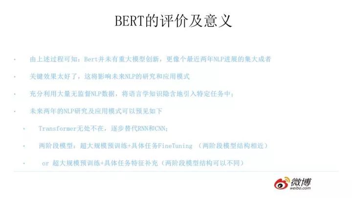 最后,我讲讲我对Bert的评价和看法,我觉得Bert是NLP里里程碑式的工作,对于后面NLP的研究和工业应用会产生长久的影响,这点毫无疑问。但是从上文介绍也可以看出,从模型或者方法角度看,Bert借鉴了ELMO,GPT及CBOW,主要提出了Masked 语言模型及Next Sentence Prediction,但是这里Next Sentence Prediction基本不影响大局,而Masked LM明显借鉴了CBOW的思想。所以说Bert的模型没什么大的创新,更像最近几年NLP重要进展的集大成者,这点如果你看懂了上文估计也没有太大异议,如果你有大的异议,杠精这个大帽子我随时准备戴给你。如果归纳一下这些进展就是:首先是两阶段模型,第一阶段双向语言模型预训练,这里注意要用双向而不是单向,第二阶段采用具体任务Fine-tuning或者做特征集成;第二是特征抽取要用Transformer作为特征提取器而不是RNN或者CNN;第三,双向语言模型可以采取CBOW的方法去做(当然我觉得这个是个细节问题,不算太关键,前两个因素比较关键)。Bert最大的亮点在于效果好及普适性强,几乎所有NLP任务都可以套用Bert这种两阶段解决思路,而且效果应该会有明显提升。可以预见的是,未来一段时间在NLP应用领域,Transformer将占据主导地位,而且这种两阶段预训练方法也会主导各种应用。