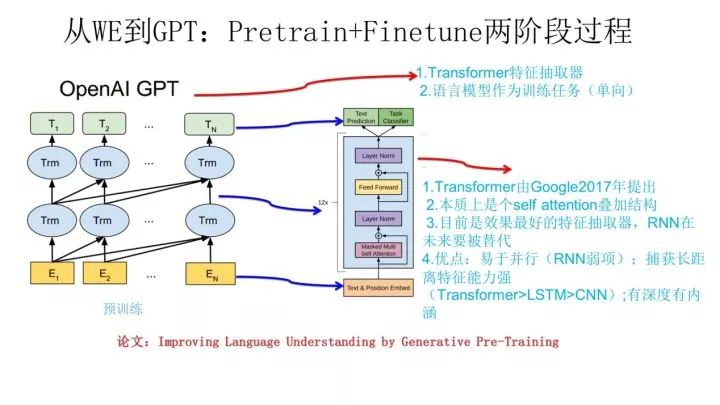 我们如果把ELMO这种预训练方法和图像领域的预训练方法对比,发现两者模式看上去还是有很大差异的。除了以ELMO为代表的这种基于特征融合的预训练方法外,NLP里还有一种典型做法,这种做法和图像领域的方式就是看上去一致的了,一般将这种方法称为“基于Fine-tuning的模式”,而GPT就是这一模式的典型开创者。