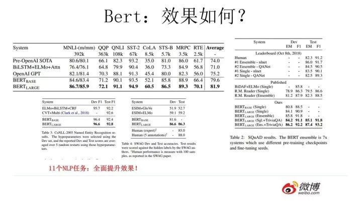 Bert采用这种两阶段方式解决各种NLP任务效果如何?在11个各种类型的NLP任务中达到目前最好的效果,某些任务性能有极大的提升。一个新模型好不好,效果才是王道。