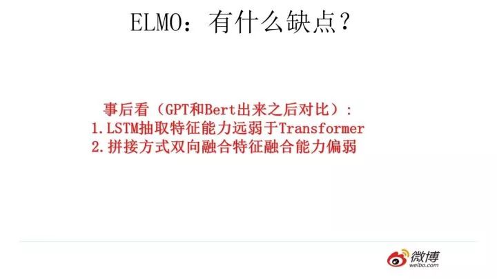 那么站在现在这个时间节点看,ELMO有什么值得改进的缺点呢?首先,一个非常明显的缺点在特征抽取器选择方面,ELMO使用了LSTM而不是新贵Transformer,Transformer是谷歌在17年做机器翻译任务的“Attention is all you need”的论文中提出的,引起了相当大的反响,很多研究已经证明了Transformer提取特征的能力是要远强于LSTM的。如果ELMO采取Transformer作为特征提取器,那么估计Bert的反响远不如现在的这种火爆场面。另外一点,ELMO采取双向拼接这种融合特征的能力可能比Bert一体化的融合特征方式弱,但是,这只是一种从道理推断产生的怀疑,目前并没有具体实验说明这一点。
