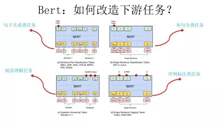 第二阶段,Fine-Tuning阶段,这个阶段的做法和GPT是一样的。当然,它也面临着下游任务网络结构改造的问题,在改造任务方面Bert和GPT有些不同,下面简单介绍一下。