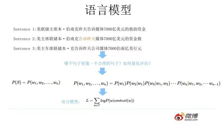 什么是语言模型?其实看上面这张PPT上扣下来的图就明白了,为了能够量化地衡量哪个句子更像一句人话,可以设计如上图所示函数,核心函数P的思想是根据句子里面前面的一系列前导单词预测后面跟哪个单词的概率大小(理论上除了上文之外,也可以引入单词的下文联合起来预测单词出现概率)。句子里面每个单词都有个根据上文预测自己的过程,把所有这些单词的产生概率乘起来,数值越大代表这越像一句人话。语言模型压下暂且不表,我隐约预感到我这么讲你可能还是不太会明白,但是大概这个意思,不懂的可以去网上找,资料多得一样地汗牛冲动。