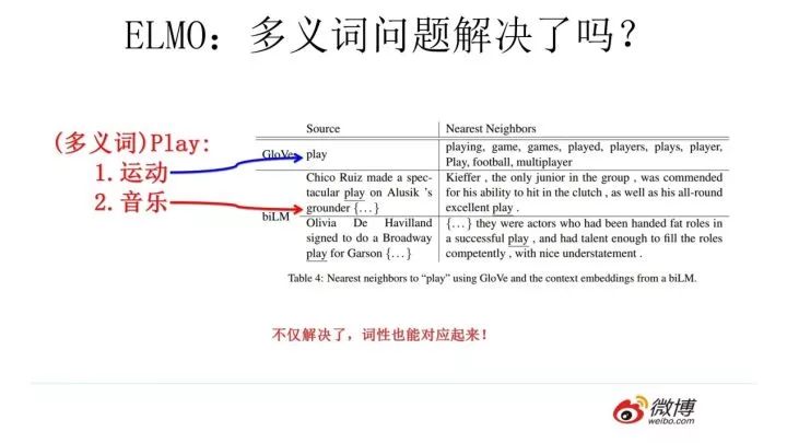 前面我们提到静态Word Embedding无法解决多义词的问题,那么ELMO引入上下文动态调整单词的embedding后多义词问题解决了吗?解决了,而且比我们期待的解决得还要好。上图给了个例子,对于Glove训练出的Word Embedding来说,多义词比如play,根据它的embedding找出的最接近的其它单词大多数集中在体育领域,这很明显是因为训练数据中包含play的句子中体育领域的数量明显占优导致;而使用ELMO,根据上下文动态调整后的embedding不仅能够找出对应的“演出”的相同语义的句子,而且还可以保证找出的句子中的play对应的词性也是相同的,这是超出期待之处。之所以会这样,是因为我们上面提到过,第一层LSTM编码了很多句法信息,这在这里起到了重要作用。