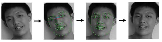 人脸校准也是,给机器的头不管是歪头、低头还是仰着头——位置都不正,那就先将脸边框截出来,为每个点进行定位(如下图中的绿点),再根据点定位出一个坐标,跟真正摆正的脸的坐标进行对比,二者相差的角度,就是头歪的角度,将图像反向旋转一下,图像就变正了。