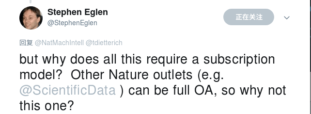 剑桥大学计算神经学家Stephen Eglen直接质疑《自然》顾左右而言他的回应,《自然》声称提供的服务和订阅模式并没有什么关系,自然的子刊《Scientific Data》就可以开放访问,为什么《机器智能》就不行?