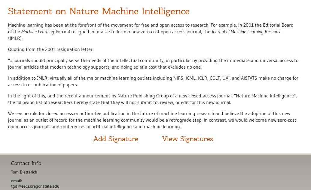 《自然》于2017年11月宣布,将于2019年发行新子刊《机器智能》(Nature Machine Intelligence)。然而,新子刊还没问世,就遭到了机器学习社区的阻击。今天,俄勒冈州立大学(Oregon State University)特聘教授Thomas G. Dietterich牵头起草了抵制《机器智能》的公开信,不到24小时,已有近千人签名,表示不会向《机器智能》投稿,不会为《机器智能》审稿,不会在《机器智能》担任编委。