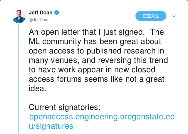 正如TensorFlow总设计师、Google Brain创始人Jeff Dean在签署公开信后发布的推特所言,机器学习社区在推动研究成果的开放获取上做得很出色,逆此潮流而动,将成果发表在一个封闭的平台上,不像是一个好主意。(之后Jeff Dean稍后发推补充说,尽管他本人推崇开放获取,但对论文发表持实用主义态度。当某个封闭期刊最符合论文主题时,也会向这样的期刊投稿。但在今时今日,推出一个新的封闭期刊,方向不对。)