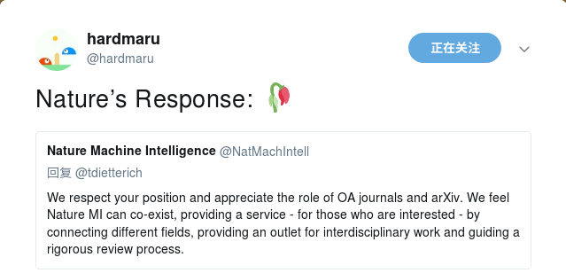《自然》后来做出了回应,说了些不痛不痒的话,什么新子刊可以和开放的期刊、arXiv共存,可以提供严谨的审稿流程等等,促进不同学科间的交流。说得好像现在机器学习开放期刊和顶会没有严谨的审稿流程,不发表跨学科的论文似的。