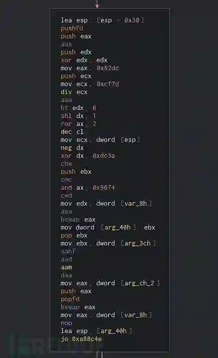 在上图中,几乎整个代码块都充满了花指令,当然能完全忽略这些花指令块就好了,但是实际分析中还是相对较难。仔细分析这些花指令块,我们也能发现一些有意思的地方,这些混淆块都是由前一个块的失效跳转而来,且都是条件跳转。而且,每个混淆块都以一个条件跳转结束,这种条件跳转与前一个混淆块的跳转相反。比如说,上图代码块中的末尾跳转条件为 jo