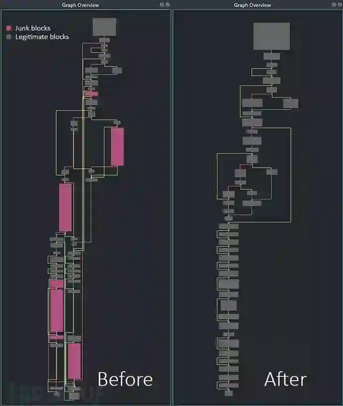 基于上述分析判断,我们可以开始构建这些混淆块的特征,混淆的第一个特征是出现两个连续的块,而且,它们以相反的条件跳转到相同的目标地址而结束。另一个特性要求第二个块不包含有意义的指令,如字符串引用或调用。