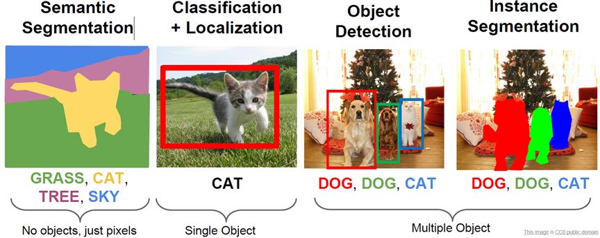 当我们谈起计算机视觉时,首先想到的就是图像分类,没错,图像分类是计算机视觉最基本的任务之一,但是在图像分类的基础上,还有更复杂和有意思的任务,如目标检测,物体定位,图像分割等,见图1所示。其中目标检测是一件比较实际的且具有挑战性的计算机视觉任务,其可以看成图像分类与定位的结合,给定一张图片,目标检测系统要能够识别出图片的目标并给出其位置,由于图片中目标数是不定的,且要给出目标的精确位置,目标检测相比分类任务更复杂。目标检测的一个实际应用场景就是无人驾驶,如果能够在无人车上装载一个有效的目标检测系统,那么无人车将和人一样有了眼睛,可以快速地检测出前面的行人与车辆,从而作出实时决策。