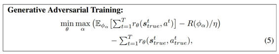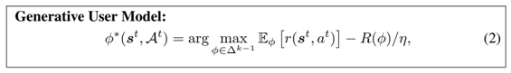更确切地说,给定某个用户的 T 个观测到的行为的轨迹 {a^1_true, a^2_true, . . . , a^T_true} 及相应的所点击物品的特征 {f^1_∗ , f^2_∗ , . . . , f^T_∗ },研究者通过求解下面的极小化极大优化方法共同学习到用户的行为模型和奖励函数: