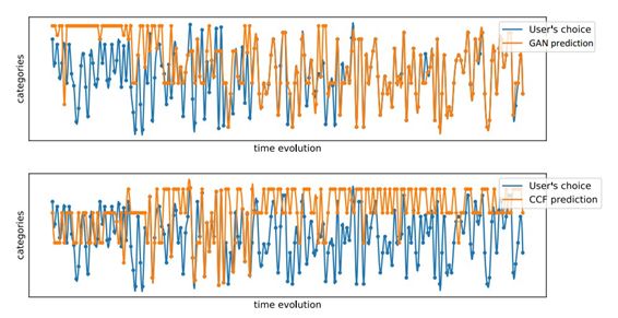 另一个在 Movielens 上得到的结果很有趣,如图 3 所示。蓝色曲线表示用户随时间推移的实际选择。橙色曲线则是 GAN 和 W&D-CCF 预测的行为轨迹。