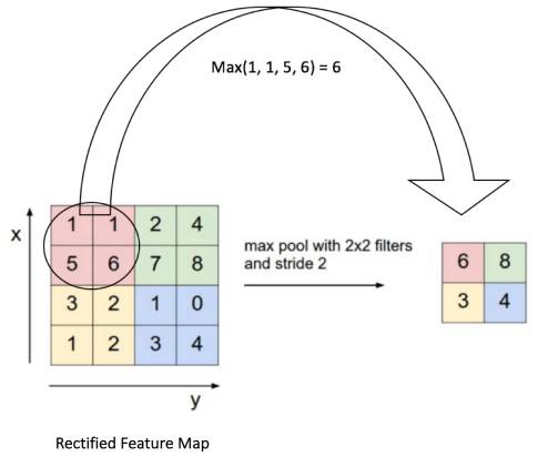 首先对红色2x2区域进行池化,由于此2x2区域的最大值为6.那么对应的池化输出位置的值为6,由于步幅为2,此时移动到绿色的位置去进行池化,输出的最大值为8.同样的方法,可以得到黄色区域和蓝色区域的输出值。最终,我们的输入4x4的矩阵在池化后变成了2x2的矩阵。进行了压缩。