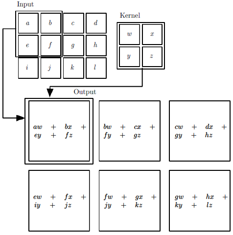 举个例子如下:图中的输入是一个二维的3x4的矩阵,而卷积核是一个2x2的矩阵。这里我们假设卷积是一次移动一个像素来卷积的,那么首先我们对输入的左上角2x2局部和卷积核卷积,即各个位置的元素相乘再相加,得到的输出矩阵S的S00的元素,值为aw+bx+ey+fz。接着我们将输入的局部向右平移一个像素,现在是(b,c,f,g)四个元素构成的矩阵和卷积核来卷积,这样我们得到了输出矩阵S的S01的元素,同样的方法,我们可以得到输出矩阵S的S02,S10,S11,S12的元素。