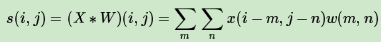 在CNN中,虽然我们也是说卷积,但是我们的卷积公式和严格意义数学中的定义稍有不同,比如对于二维的卷积,定义为: