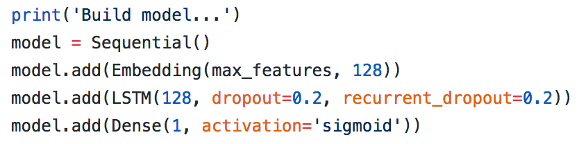 完整代码:https://github.com/fchollet/keras/blob/master/examples/imdb_lstm.py