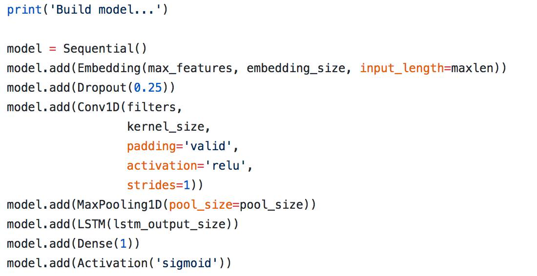 完整代码: https://github.com/fchollet/keras/blob/master/examples/imdb_cnn_lstm.py