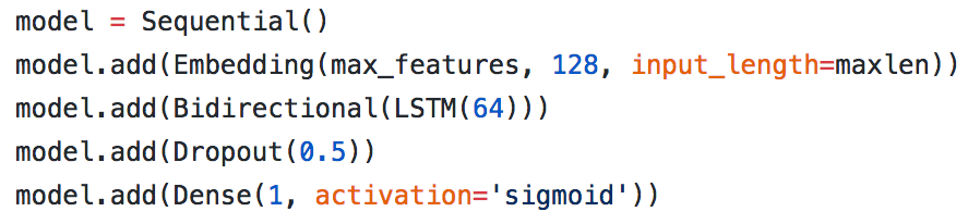 完整代码:https://github.com/fchollet/keras/blob/master/examples/imdb_bidirectional_lstm.py