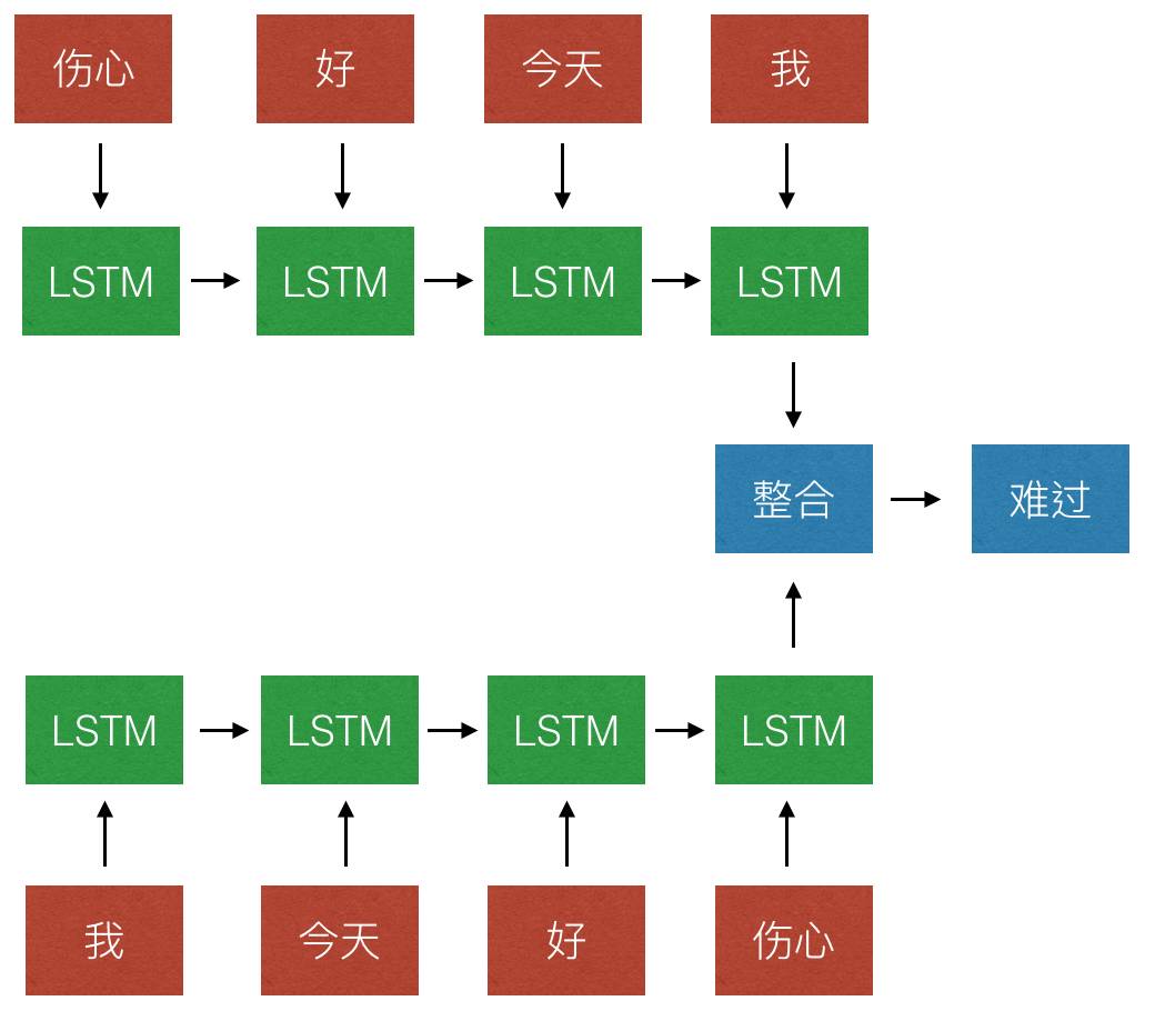 这种做法有一个好处,以这句话「我今天好伤心」为例,重点刚好在句尾。但如果换一个句子,「真开心,明天要出去玩了」,此句的重点则在句首。因此,可以用 Bi-directional LSTM 来处理这种问题。
