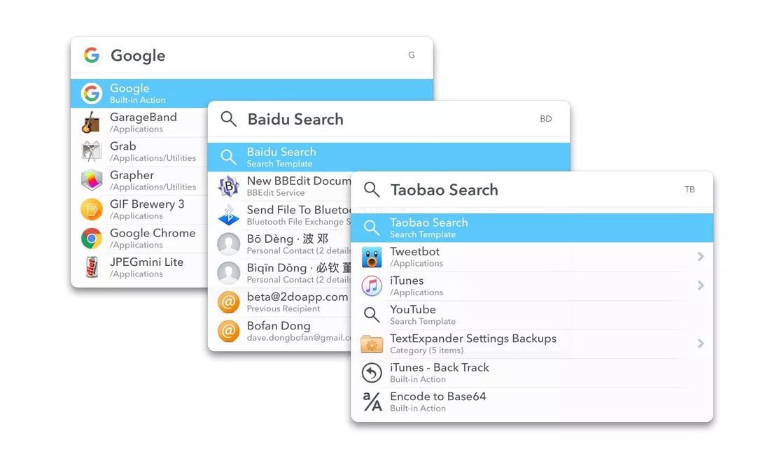 你也可以用它来自定义网页搜索,激活 LaunchBar 后,输入 g,就能使用 Google 进行搜索;输入 bd,就能进行百度搜索;输入 tb,就行进行淘宝搜索。