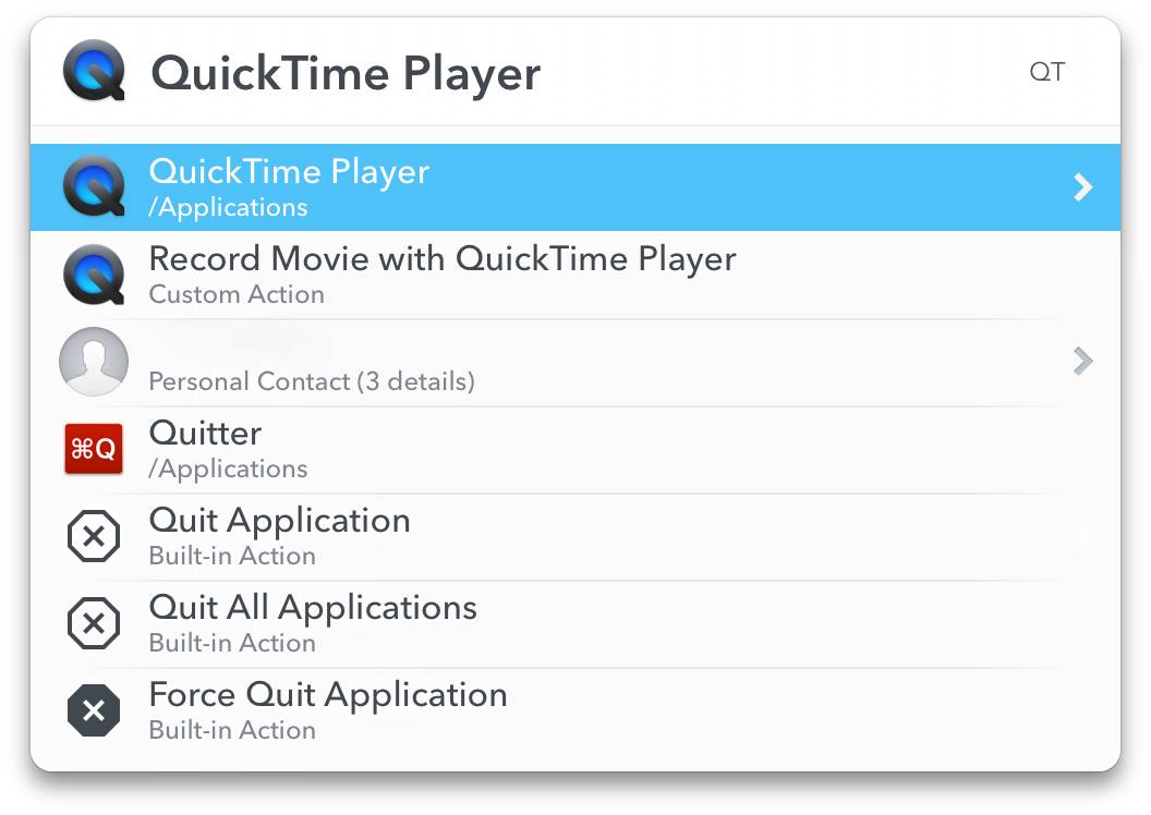 LaunchBar 是一款 macOS 上的启动器应用,它可以用来实现很多功能,比如最简单的快速启动应用,激活 LaunchBar 后,输入 qt,再敲下回车,就能立刻打开藏在文件夹深处的 QuickTime Player。