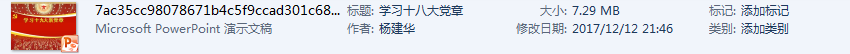 该漏洞文档是一个关于十九大的PPT,其最后修改时间为2017年12月12日。根据文档文件中的元数据,可以推测攻击者从网上检索到了“杨建华”制作的学习十八大党章的PPT文档,由名字为"steusr"的用户最后修改该文档内容制作为诱导文档。