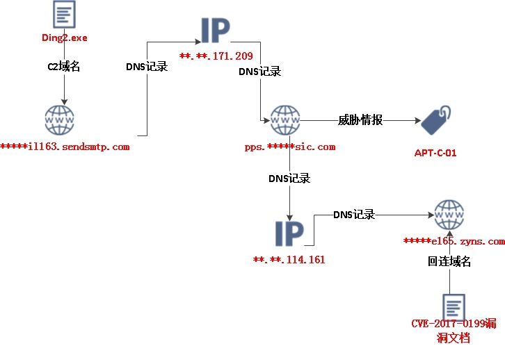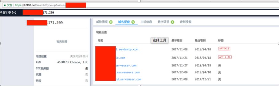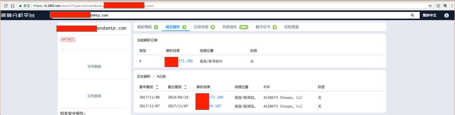 1.结合360威胁情报平台对C&C域名进行关联分析。这里我们对该团伙这次行动中(ding2.exe)使用的C&C域名*****il163.sendsmtp.com进行分析,其当前解析IP为*****.*****.171.209。