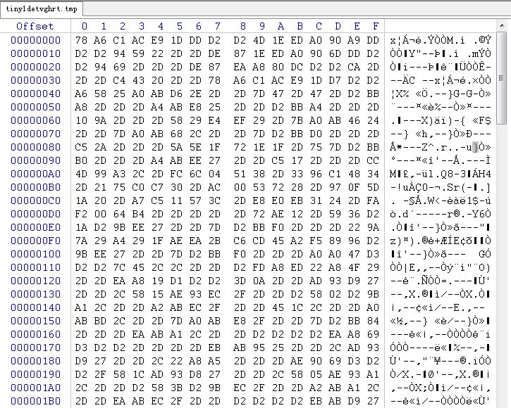 分发域名地址托管的.tmp文件均为逐字节异或的shellcode,如下图为从分发域名下载的tinyq1detvghrt.tmp文件,该文件是和0x2d异或加密的数据。