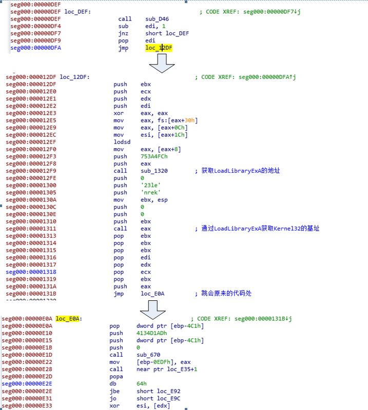 在原有获取kernel32基址代码前增加跳转指令跳转到shellcode尾部,其patch代码增加在尾部;