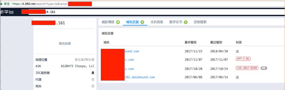 5.对域名历史映射的IP地址***.***.114.161进行查询,发现*****e165.zyns.com域名,这个域名同样也是ChangeIP动态域名,并且曾经用于CVE-2017-0199的漏洞文档。