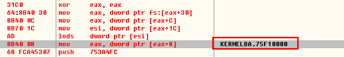 由于Poison Ivy已经停止更新,所以攻击团伙为了使shellcode能够执行在后续版本的Windows系统,其采用了代码Patch对获取kernel32基址的代码做了改进。