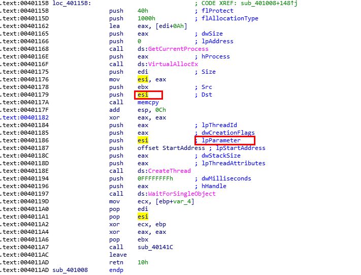 之后把解密完的shellcode在新创建的线程中执行,如图: