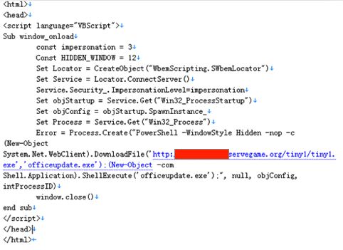 并且进一步下载恶意的HTA文件,其执行PowerShell指令下载Loader程序,保存为officeupdate.exe并执行。
