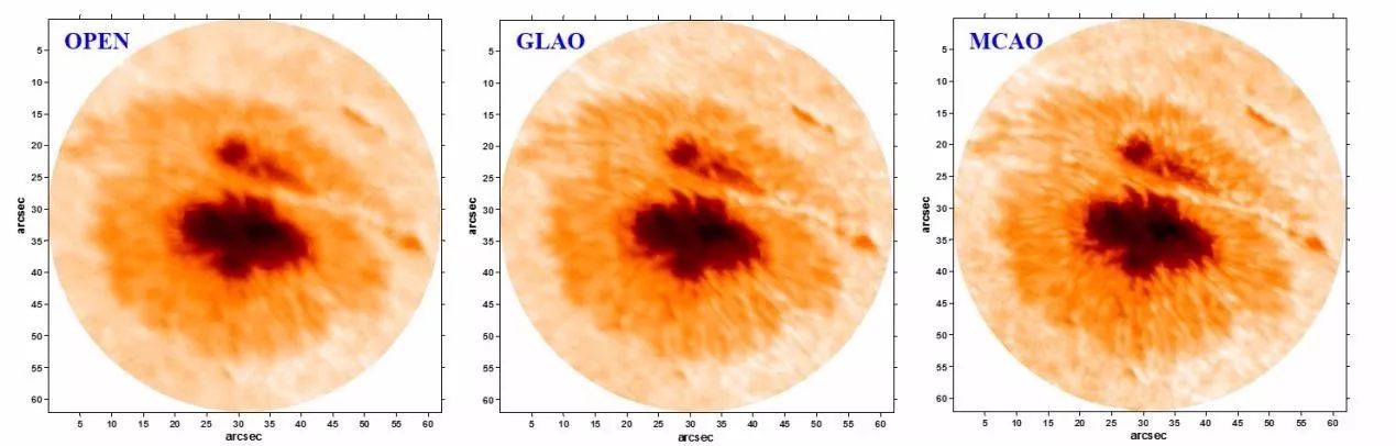我国在多层共轭自适应光学技术方面,近期也取得了突破性进展。中科院光电技术研究所太阳高分辨力光学成像技术团队在饶长辉研究员的带领下,针对云南天文台1米新真空太阳望远镜,成功研制了太阳多层共轭自适应光学系统原理样机,并在2017年国庆期间实现对太阳活动区的大视场闭环校正成像观测,在国内首次利用 MCAO 技术获取到太阳活动区大视场高分辨力实时图像(图6所示)。该试验的成功,标志着我国在下一代自适应光学技术领域取得重大突破,使我国成为继美国和德国之后,第三个掌握太阳多层共轭自适应光学技术的国家。