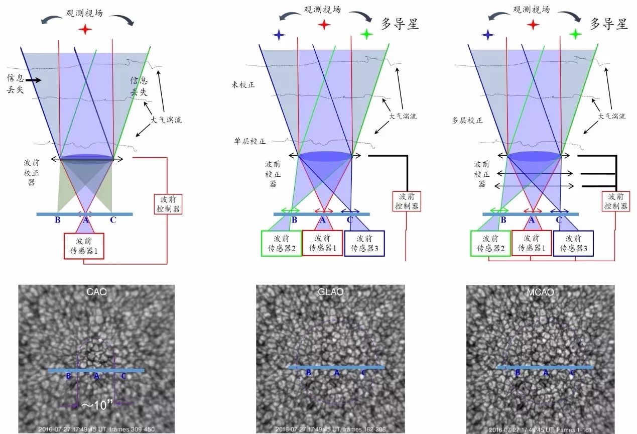 图5:传统自适应光学(左)、地表层自适应光学(中)以及多层共轭自适应光学基本概念和校正效果(太阳图像来自于美国大熊湖1.6m口径太阳望远镜 GST 及其 MCAO 系统)