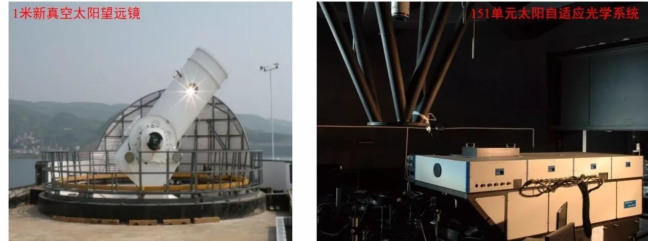 图4:1米新真空太阳望远镜(左)及其自适应光学系统(右)