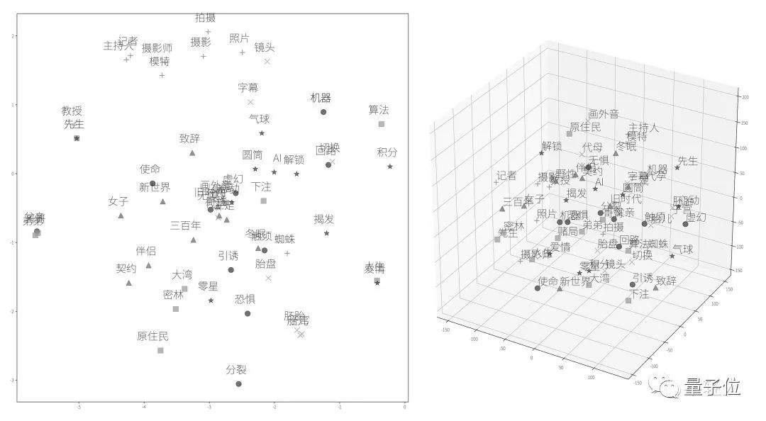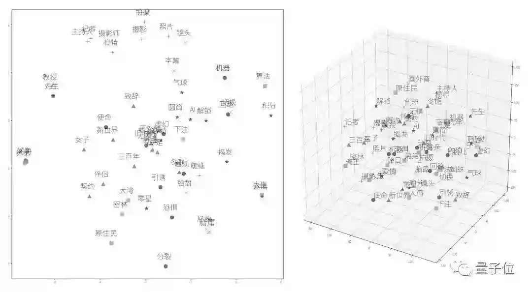 Word2vec的实用价值在于,它是主题、风格、情感等更高级建模或分析的基础。我曾抽取楸帆作品中代表性较强的词汇,计算得到每个词对应的Word2vec向量数值,再通过数学变换将百多维空间中的向量转换成二维或三维人类可见的图像【7】——这是标准的、科学意义上的“降维打击”。