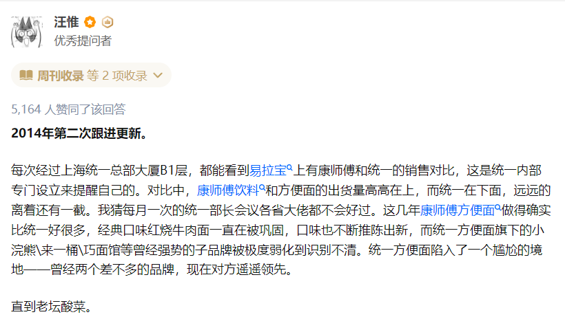 同年年底,康师傅内部还定了两大战略目标要在来年达成,一是母公司完成逆袭,顶新集团要超越统一集团;二是要把统一的老坛酸菜面给打死。