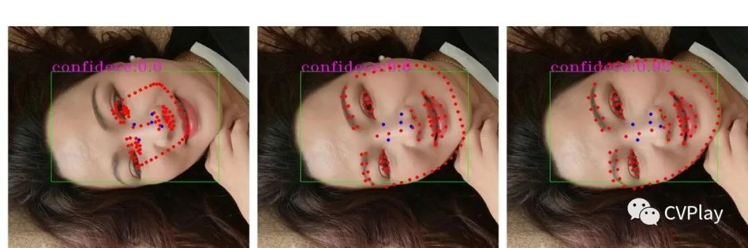 下面我们结合各路资料简单谈谈人脸关键点算法的自研,首先我们上一张极端图,以此引发算法设计的思考:图中蓝色为人脸检测器的五点,红色依次是模型的输出,左图基于人脸检测器五点做人脸对齐,中图基于左图的模型输出做人脸对齐,右图基于中图的模型输出做人脸对齐,三次精调救回极端case,证明人脸对齐对人脸关键点的回归作用很大。