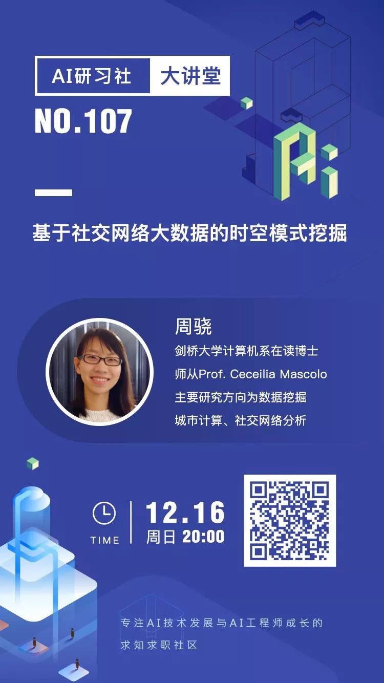 周骁,剑桥大学计算机系在读博士,师从Prof. Ceceilia Mascolo, 主要研究方向为数据挖掘、城市计算、社交网络分析。